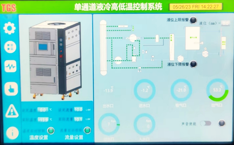 Ø本系统由一台制冷压缩机组、循环水箱、换热容器、循环泵组、控制装置等组成,默认冷却液为55%乙二醇溶液。
